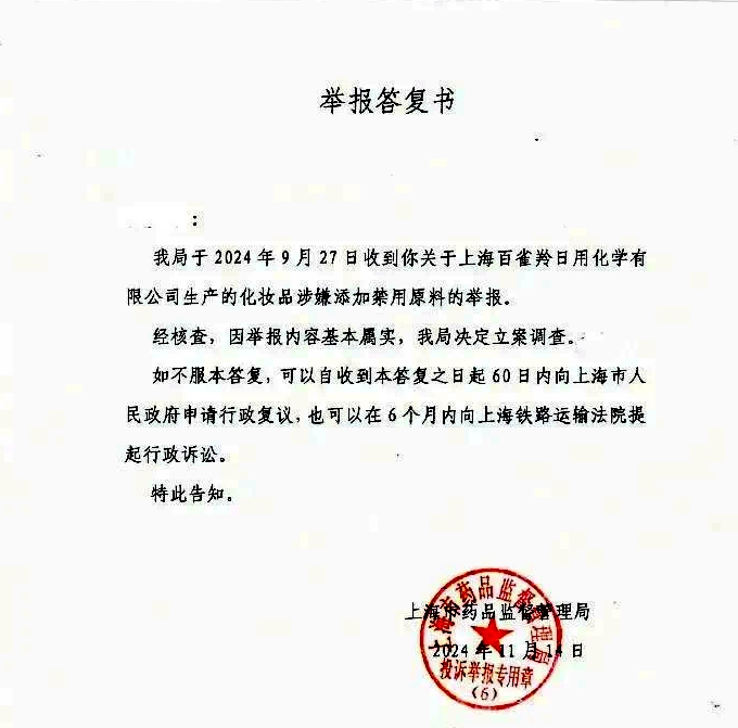 答復(fù)書中稱,上海市藥品監(jiān)督管理局于2024年9月27日收到關(guān)于上海百雀羚日用化學(xué)有限公司生產(chǎn)的化妝品涉嫌添加禁用原料的舉報(bào)。