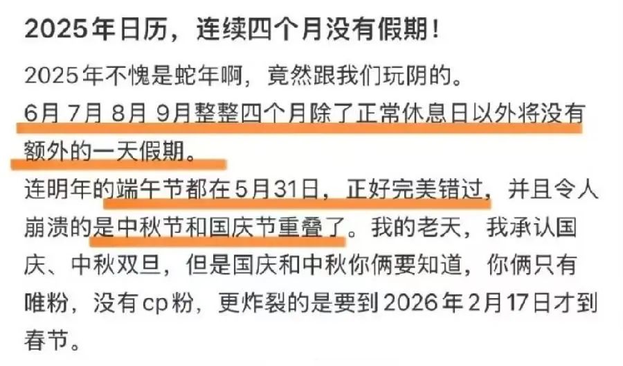 再往后看全年的假期,有網(wǎng)友發(fā)現(xiàn),2025年中秋節(jié)在10月6日,恰逢國慶長假,而端午節(jié)在5月31日,這意味著明年6月~9月除周末外,整整4個月都沒有法定節(jié)假日。