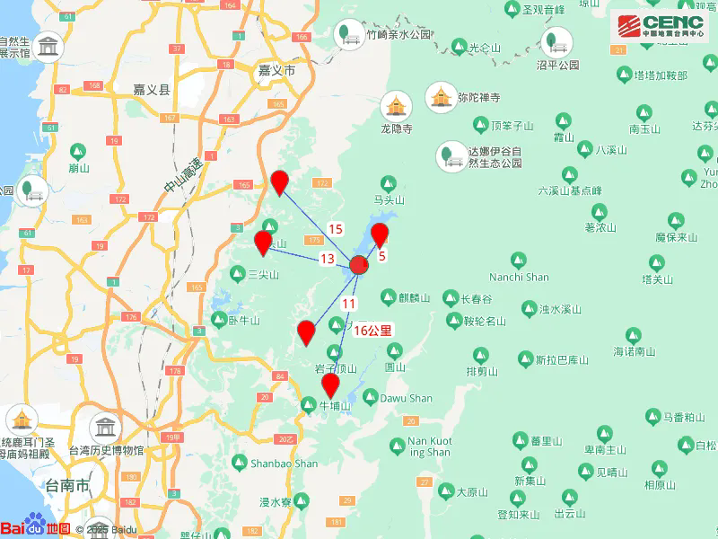 周邊縣城:震中距大埔鄉(xiāng)5公里、距楠西區(qū)11公里、距東山區(qū)13公里、距白河區(qū)15公里、距南化區(qū)16公里,距嘉義市28公里,距臺(tái)北市223公里。