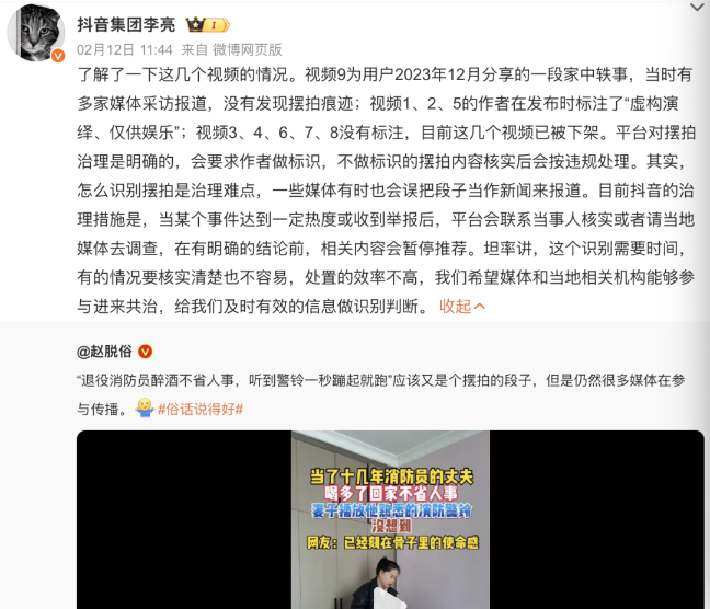 2月12日,抖音集團(tuán)副總裁李亮在微博發(fā)文談及視頻“擺拍”亂象。他表示,平臺(tái)對(duì)擺拍治理是明確的,會(huì)要求作者做標(biāo)識(shí),不做標(biāo)識(shí)的擺拍內(nèi)容核實(shí)后會(huì)按違規(guī)處理!霸趺醋R(shí)別擺拍是治理難點(diǎn),一些媒體有時(shí)也會(huì)誤把段子當(dāng)作新聞來報(bào)道。目前抖音的治理措施是,當(dāng)某個(gè)事件達(dá)到一定熱度或收到舉報(bào)后,平臺(tái)會(huì)聯(lián)系當(dāng)事人核實(shí)或者請(qǐng)當(dāng)?shù)孛襟w去調(diào)查,在有明確的結(jié)論前,相關(guān)內(nèi)容會(huì)暫停推薦。”
