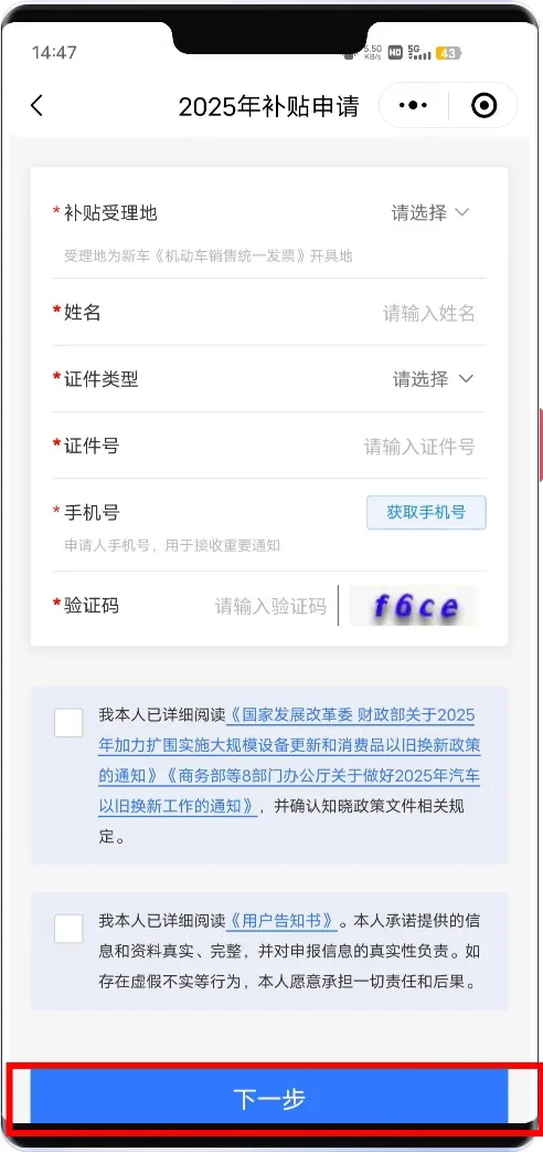 ②選擇補(bǔ)貼受理地,根據(jù)提示輸入個(gè)人信息,點(diǎn)擊下一步。