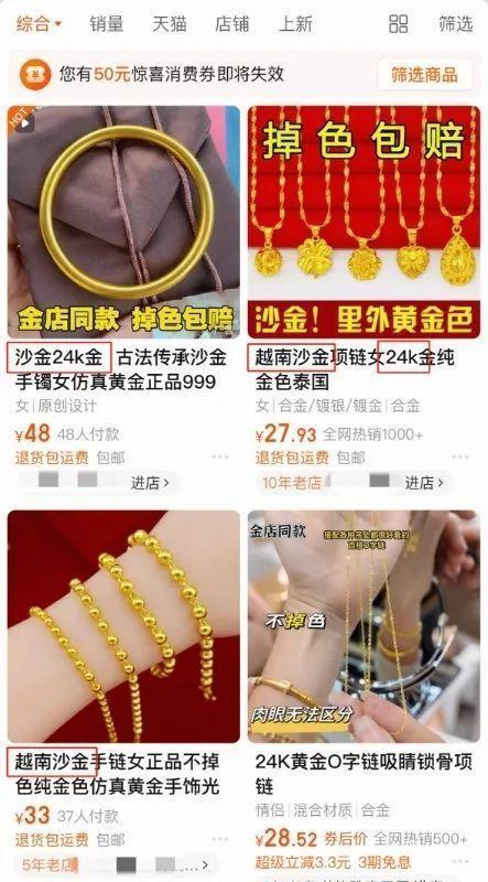 記者經(jīng)過調(diào)查發(fā)現(xiàn),多數(shù)所謂的“沙金”飾品,實(shí)為電鍍的合金材質(zhì),甚至有些完全不含黃金成分。而宣傳所謂的“越南沙金”“緬甸沙金”“泰國(guó)沙金”更多則是一種噱頭。