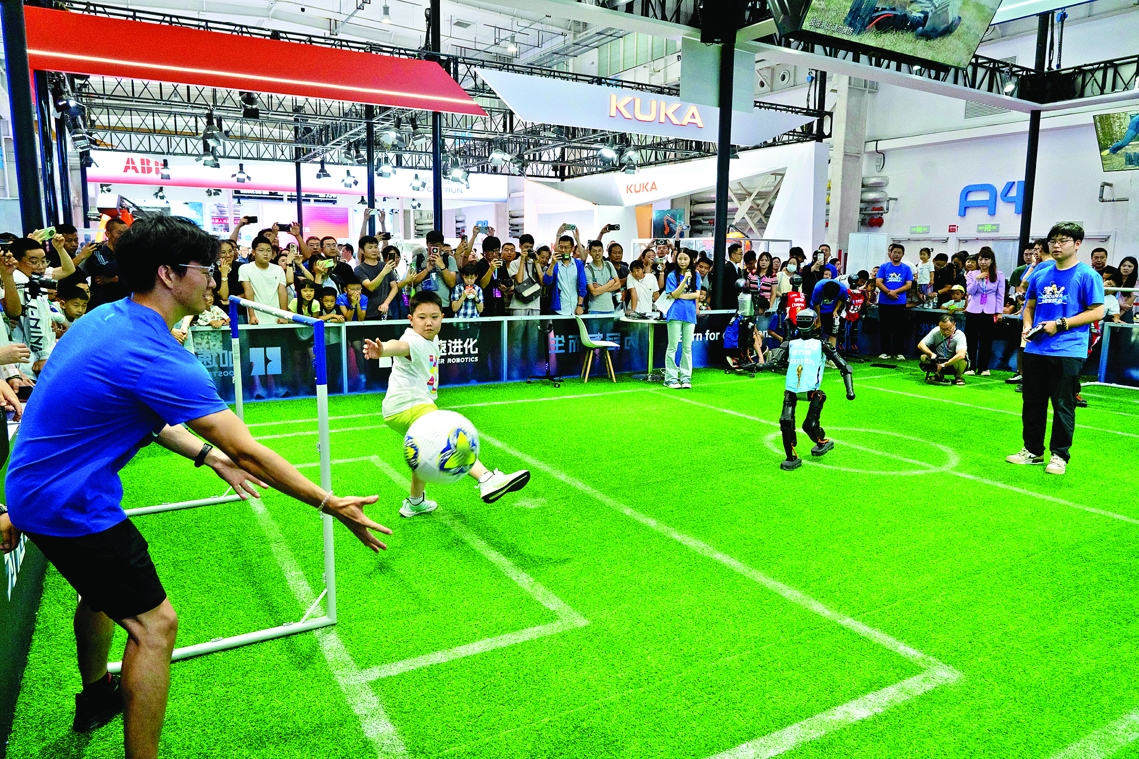 觀眾在2025世界機(jī)器人大會(huì)上與機(jī)器人踢足球。新華社發(fā)