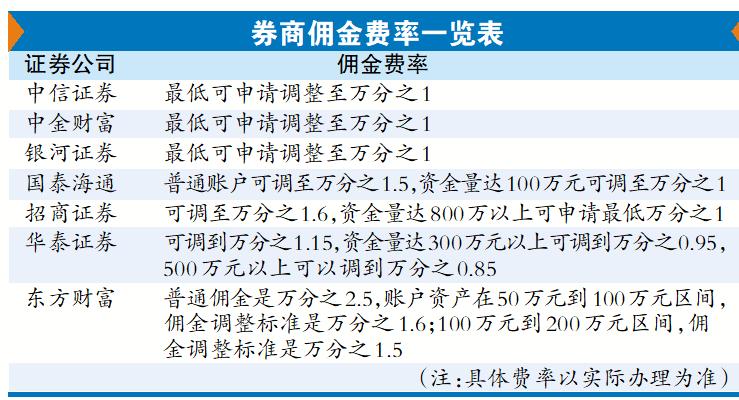 中信證券、中金財富、銀河證券等券商,傭金最低可申請調(diào)整至萬分之1。部分券商則根據(jù)資金規(guī)模提供更低費率。國泰海通對普通賬戶可調(diào)整至萬分之1.5左右,資金量達到100萬元則可以調(diào)整至萬分之1,交易頻繁可申請再低。招商證券可調(diào)整至萬分之1.6,如果資金量達到800萬以上,可做特殊申請,最低可至萬分之1。