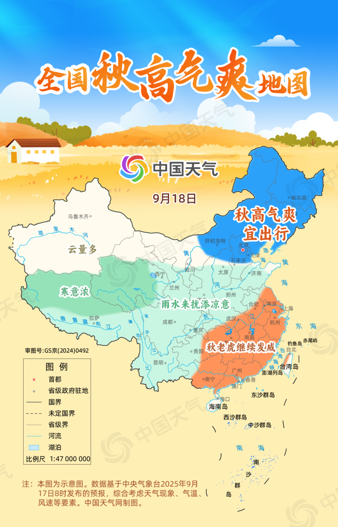 爽在體感舒適。進(jìn)入秋季,副熱帶高壓也逐漸減弱東退,暖濕氣流減弱,空氣變得干爽、暑熱漸消。常年9月,東北大部、西北地區(qū)東部及新疆等地平均最高氣溫均在20℃至26℃之間,體感舒爽。除此之外,秋季我國(guó)冷空氣活動(dòng)雖然頻繁,但總體強(qiáng)度比冬季弱,因此涼風(fēng)習(xí)習(xí),體感舒適。