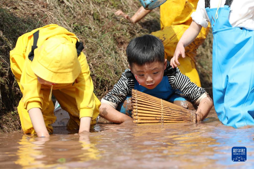 4月10日,四川省廣安市武勝縣東方紅幼兒園的小朋友在龍女鎮(zhèn)的稻田里抓魚。