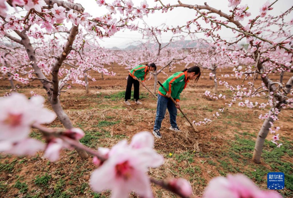 4月10日,河北省遵化市東舊寨鎮(zhèn)梁屯中心小學(xué)的學(xué)生在桃樹果園體驗(yàn)鋤草勞動(dòng)。