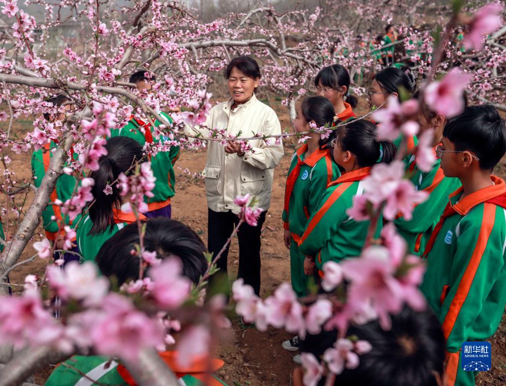 4月10日,技術(shù)人員在桃樹果園向河北省遵化市東舊寨鎮(zhèn)梁屯中心小學(xué)的學(xué)生介紹桃樹生長(zhǎng)知識(shí)。