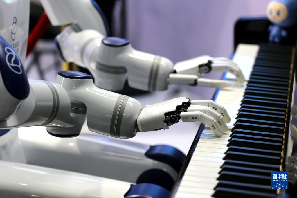 5月24日,機(jī)器人在峰會(huì)現(xiàn)場(chǎng)彈奏鋼琴。