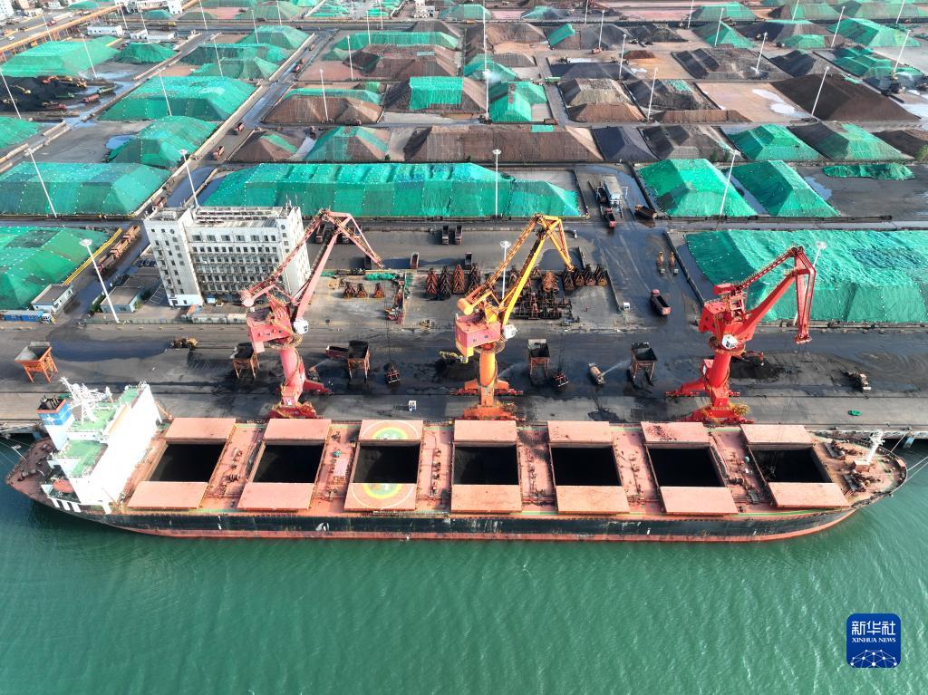 5月24日,貨輪在江蘇省連云港港煤炭碼頭卸運(yùn)電煤(無人機(jī)照片)。