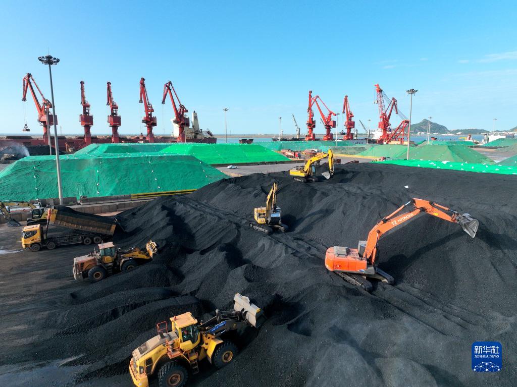 5月24日,大型機(jī)械在江蘇省連云港港煤炭碼頭堆放儲(chǔ)存剛從貨輪卸運(yùn)的電煤(無人機(jī)照片)。