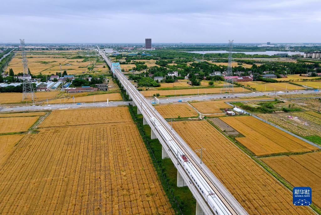 5月24日,在江蘇省如皋市城南街道新莊社區(qū),動車組列車從金色的小麥田間駛過(無人機照片)。