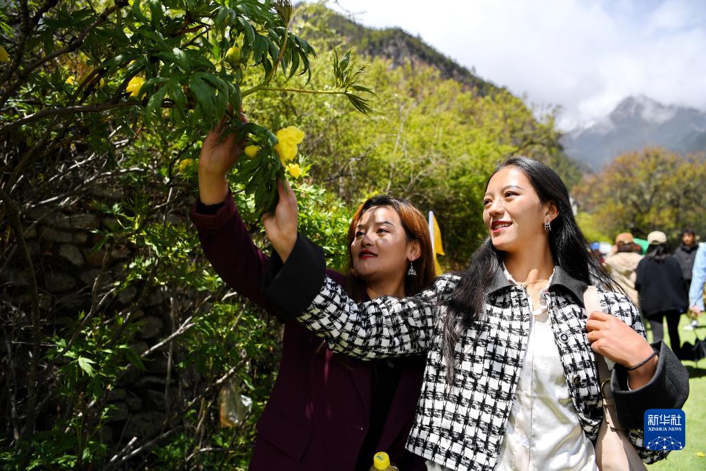 5月28日,兩名游客在米林市南伊珞巴民族鄉(xiāng)扎貢溝觀賞野生大花黃牡丹。