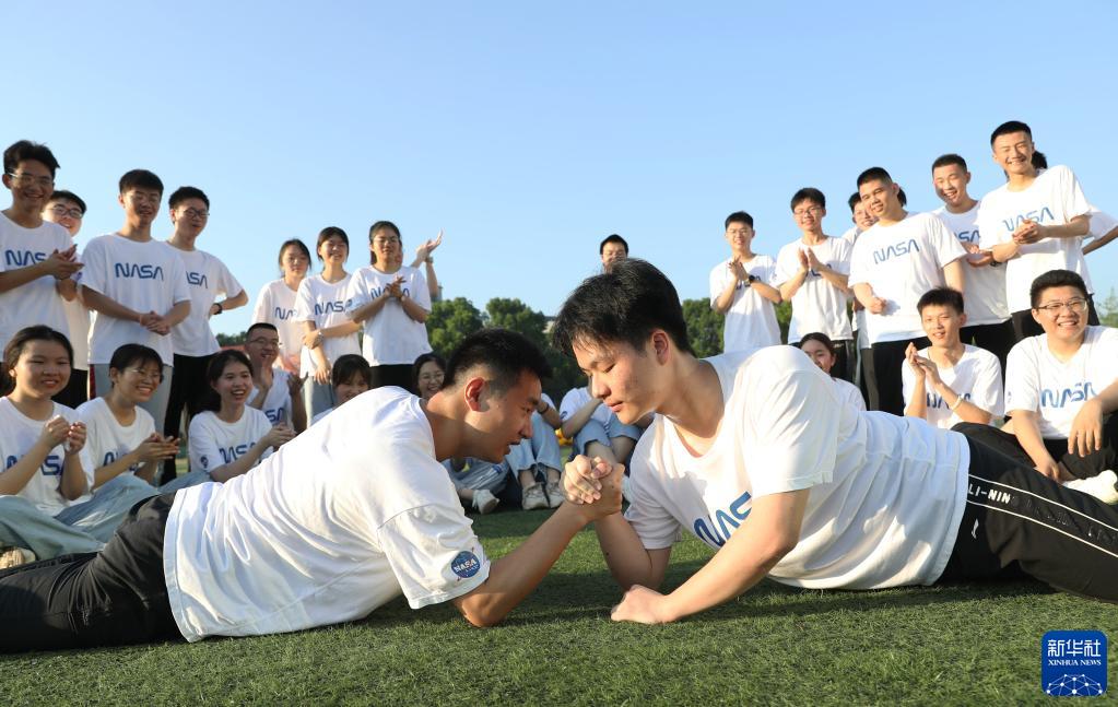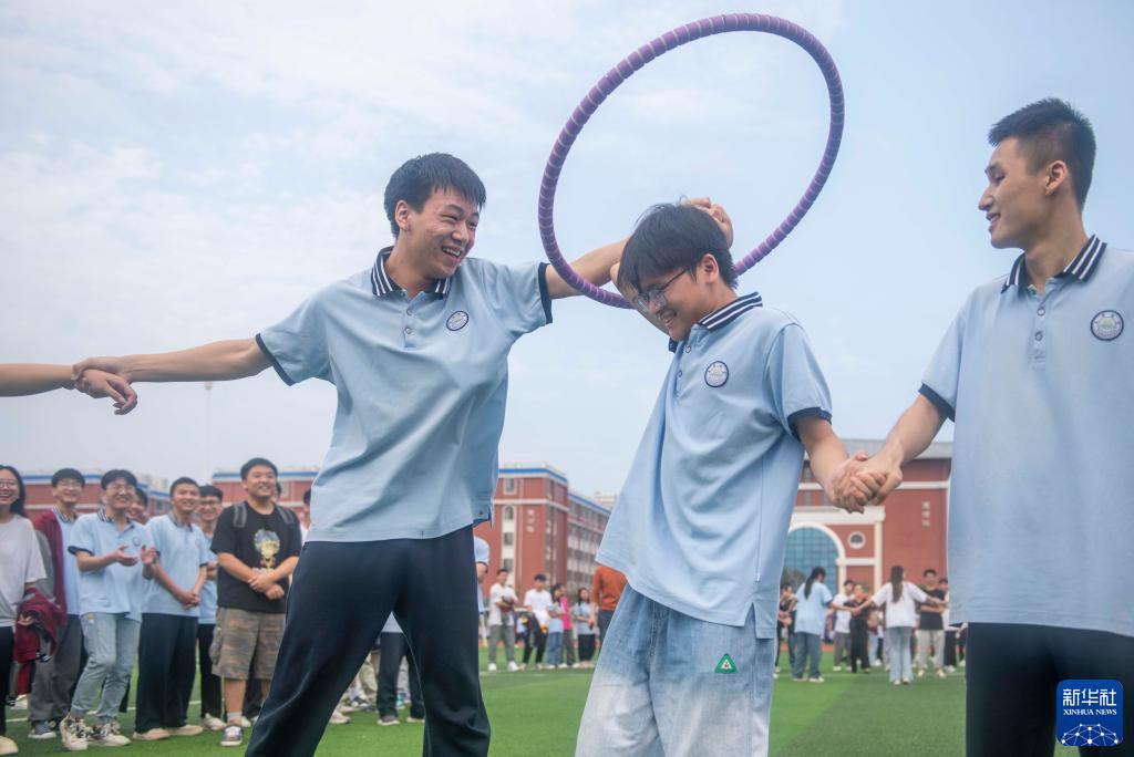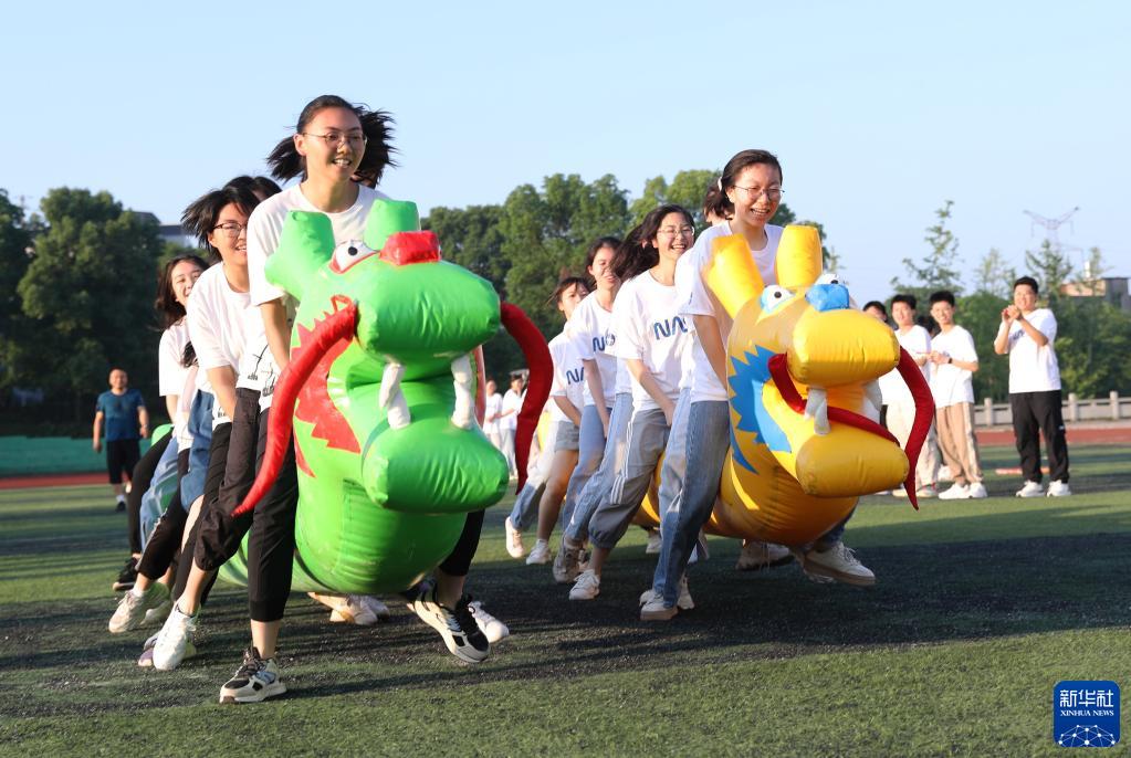 5月25日,在湖南省永州市道縣道州玉潭(東陽)學(xué)校,高三學(xué)生在操場(chǎng)上做減壓趣味活動(dòng)。