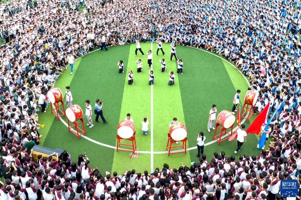 5月29日,湖北省宣恩縣第一高級(jí)中學(xué)學(xué)生在快閃活動(dòng)中表演鼓舞(無人機(jī)照片)。