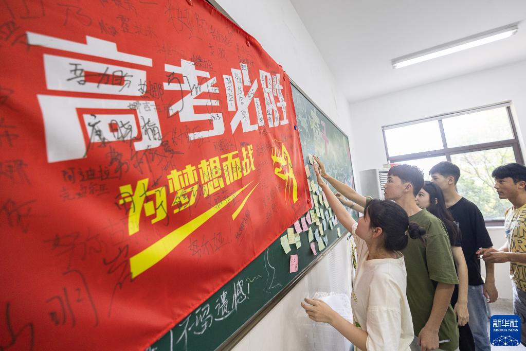 5月28日,在浙江省湖州市長(zhǎng)興縣職業(yè)技術(shù)教育中心學(xué)校,高三學(xué)生在黑板上粘貼高考寄語。