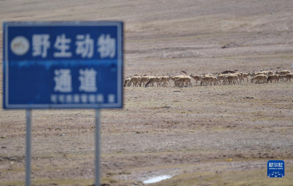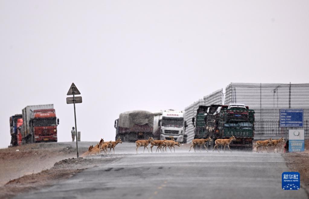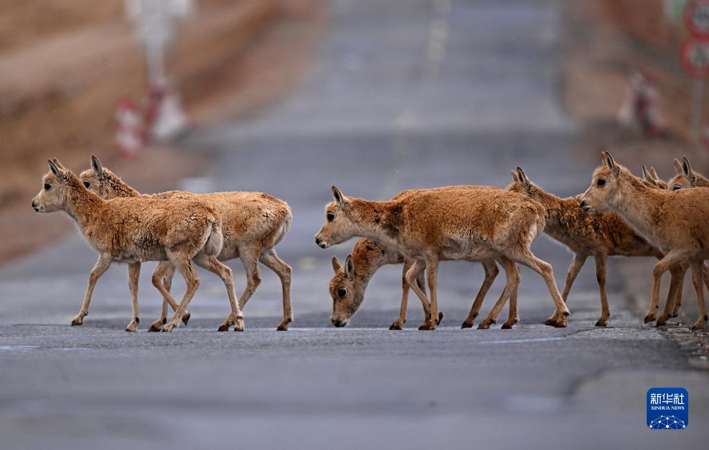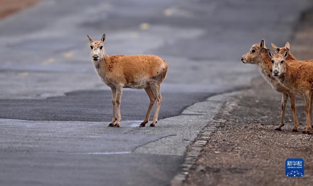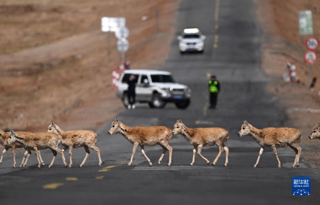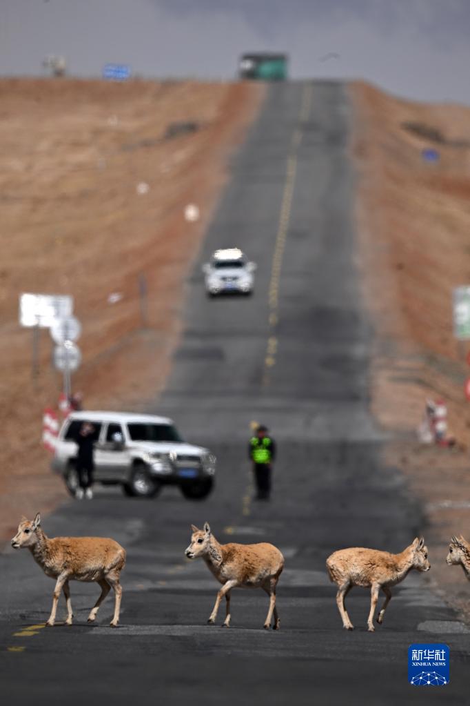 5月29日,在青?煽晌骼铮蝗捍菩源a(chǎn)藏羚羊通過青藏公路。