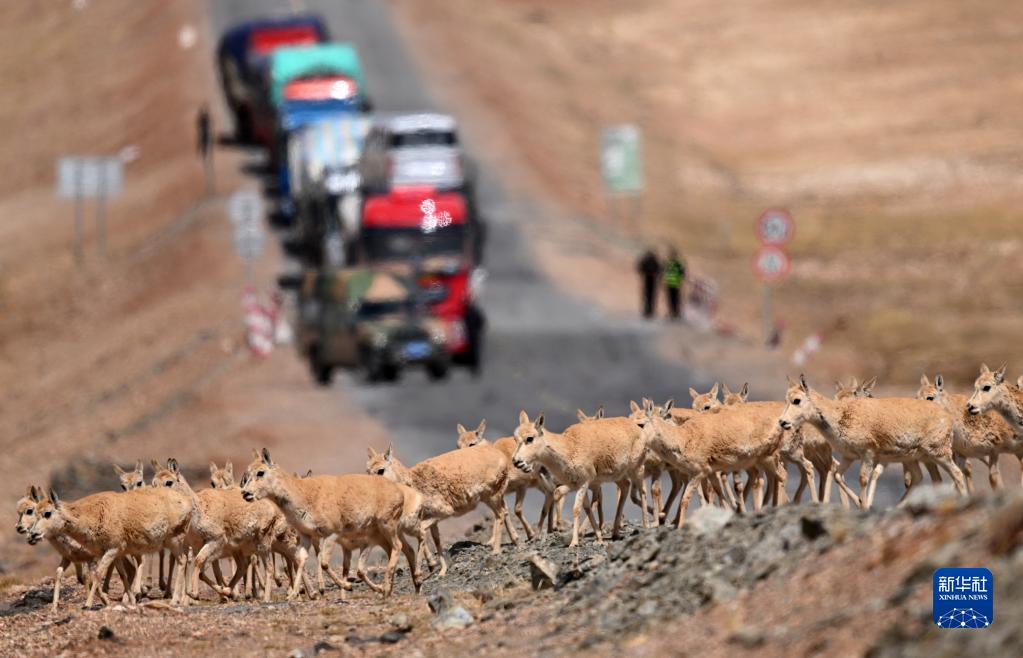5月28日,在青海可可西里,幾只雌性待產(chǎn)藏羚羊準(zhǔn)備通過青藏公路。