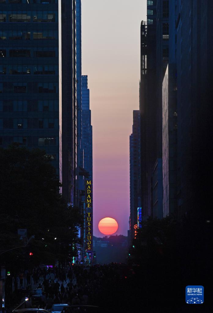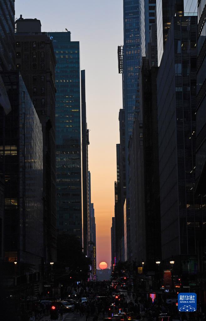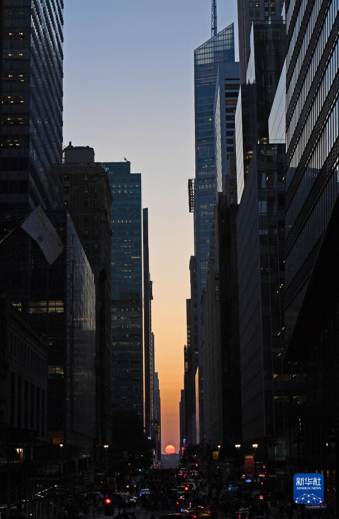 當(dāng)日,紐約出現(xiàn)“曼哈頓懸日”景觀。“曼哈頓懸日”是紐約市標(biāo)志性景觀,每年5月和7月出現(xiàn)兩次,指日落時(shí)太陽正好出現(xiàn)在曼哈頓東西向街道正上方、似乎懸在兩側(cè)高樓大廈之間的戲劇性畫面。