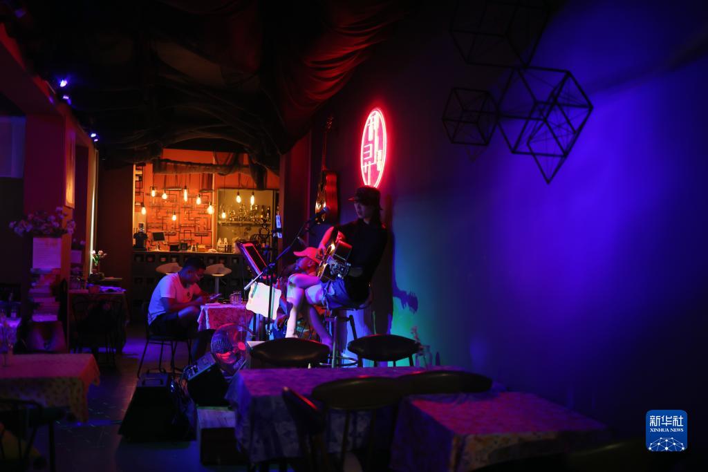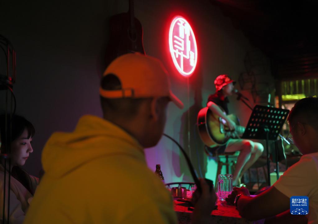 5月30日,一名歌手在普者黑景區(qū)仙人洞村一家酒館演出。