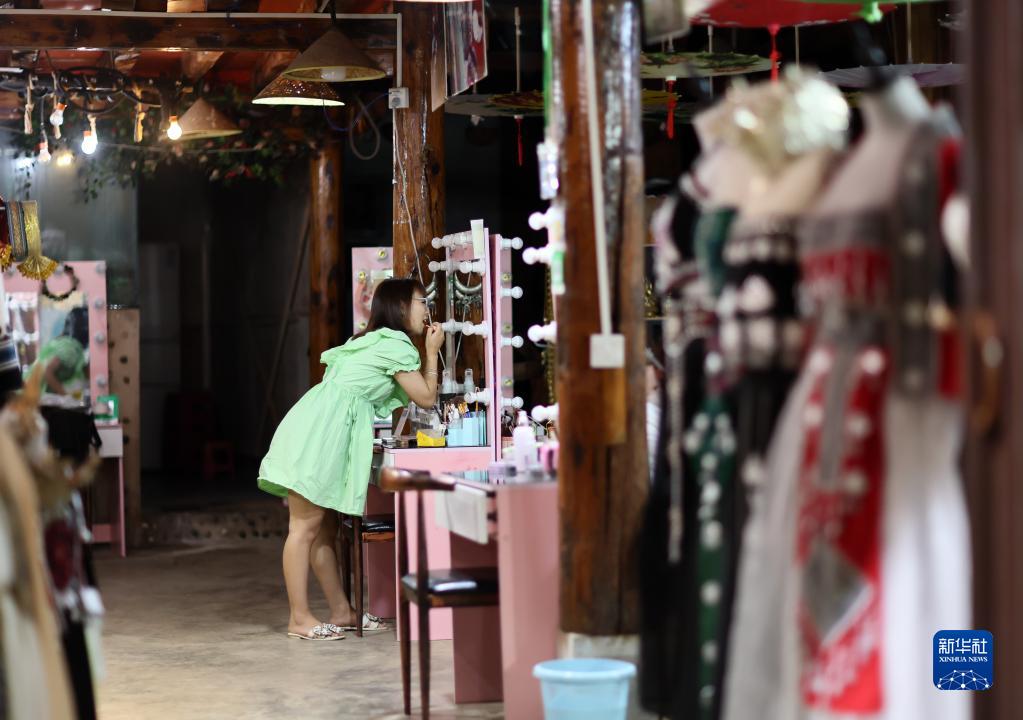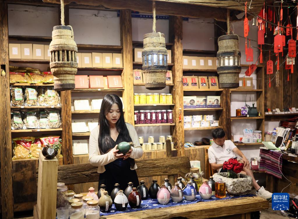 5月30日,游客在普者黑景區(qū)仙人洞村一家紀(jì)念品店體驗(yàn)。