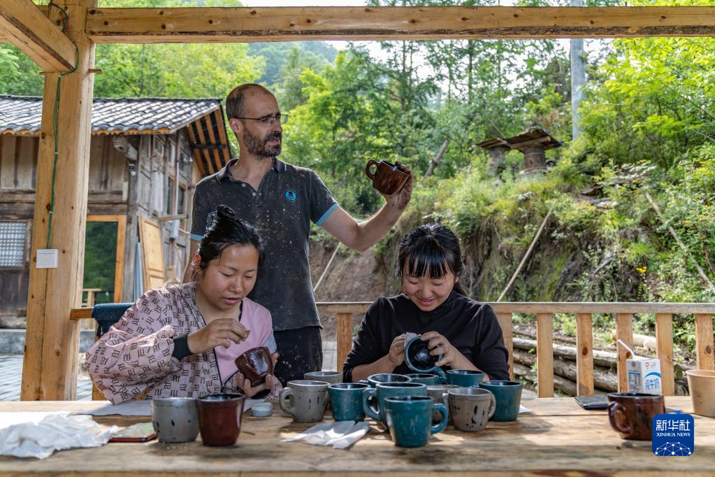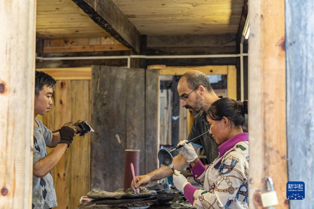 5月29日,在重慶市城口縣北屏鄉(xiāng)松柏村,文森·漆在工作室與當(dāng)?shù)卮迕窠o作品上漆。
