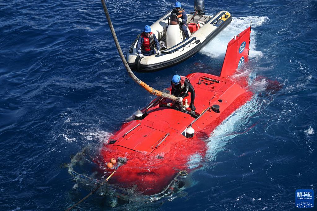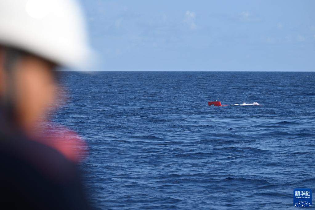 在結束當日的水下調(diào)查后,搭載著考古隊員的“深海勇士”號載人潛水器浮出海面(5月27日攝)。