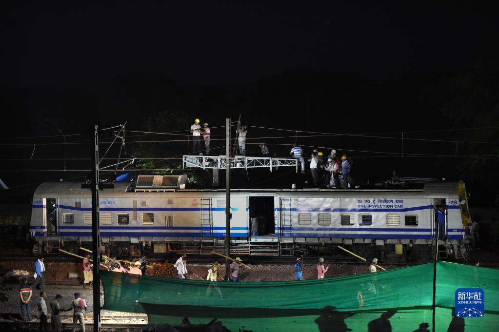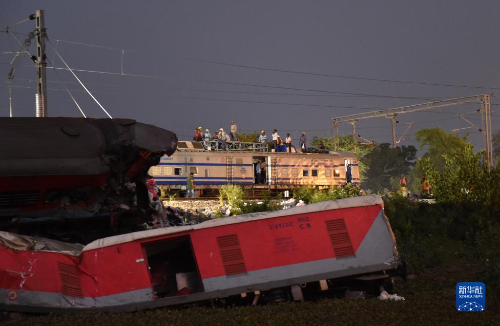 6月4日,救援人員在印度奧迪沙邦巴拉索爾地區(qū)的列車脫軌相撞事故現(xiàn)場(chǎng)工作。