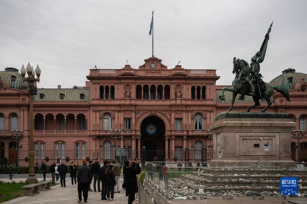 6月10日,在阿根廷首都布宜諾斯艾利斯,人們在總統(tǒng)府玫瑰宮前游覽。