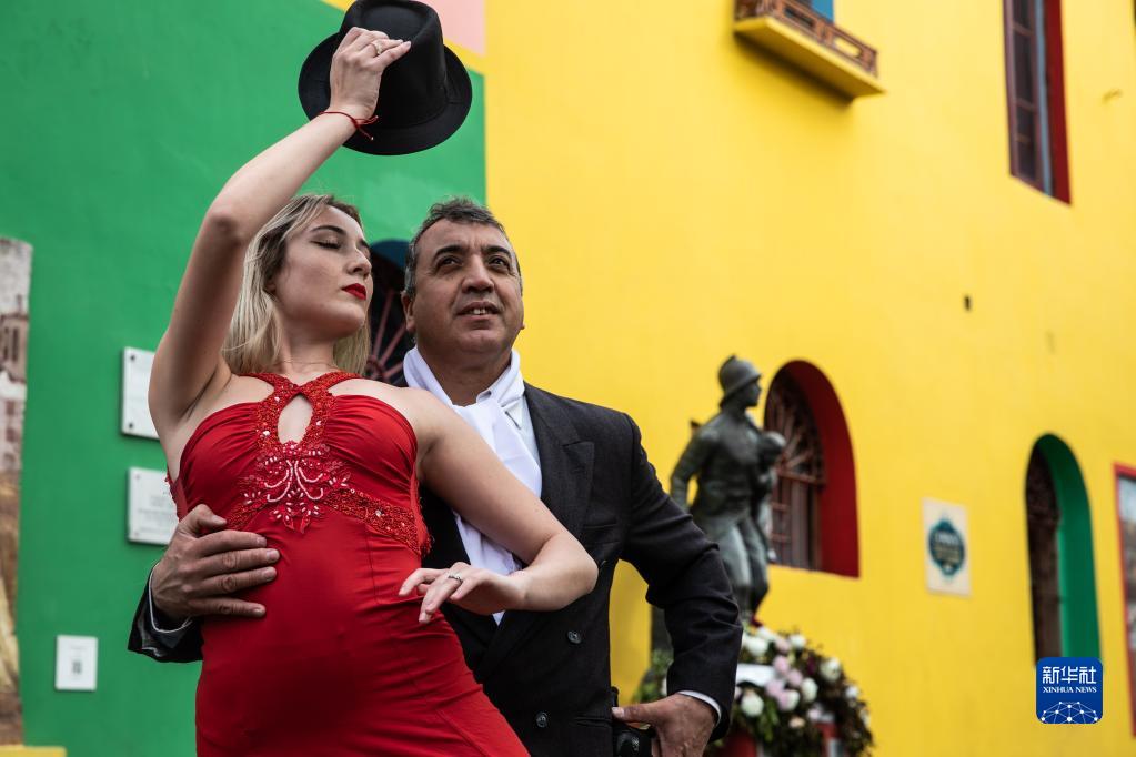 6月9日,兩名探戈舞者在阿根廷首都布宜諾斯艾利斯博卡區(qū)的街頭表演。