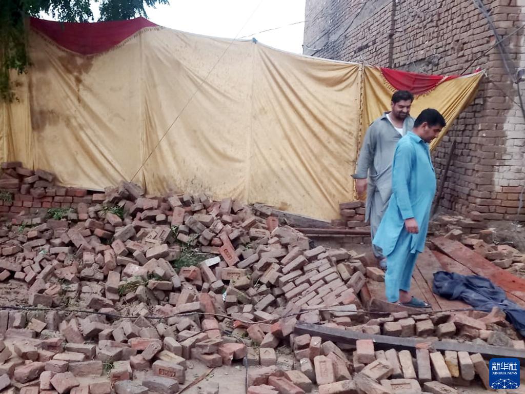 6月10日,在巴基斯坦本努地區(qū),人們站在房屋倒塌的墻壁旁(手機(jī)照片)。