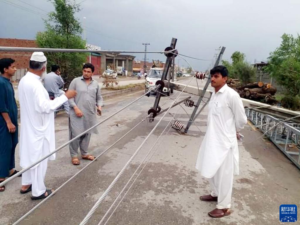 6月10日,在巴基斯坦本努地區(qū),人們查看被暴雨損毀的電線桿(手機(jī)照片)。