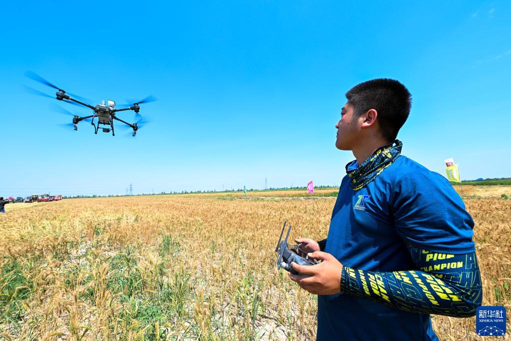 6月11日,在天津市靜海區(qū)蔡公莊鎮(zhèn),技術(shù)人員操作植保無人機(jī)。