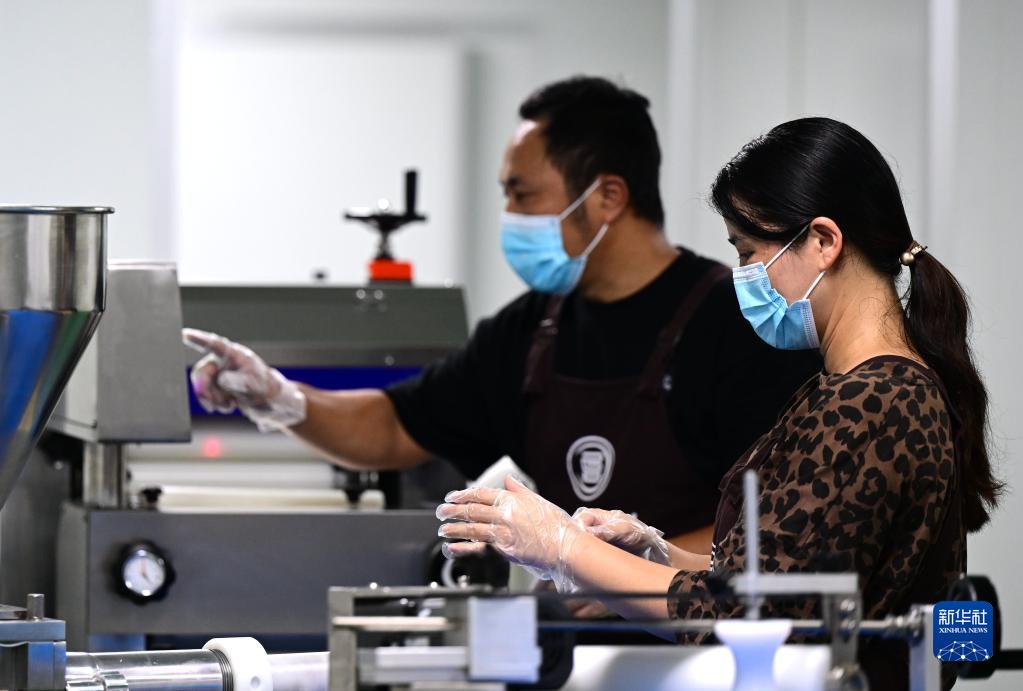 陳正信和愛(ài)人葉麗清(右)在調(diào)試嘉寶果深加工生產(chǎn)設(shè)備(6月13日攝)。