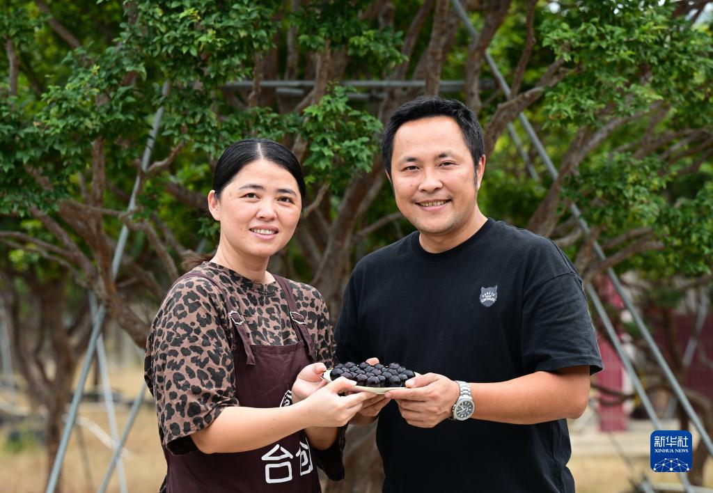 陳正信和愛(ài)人葉麗清(左)在展示嘉寶果(6月13日攝)。
