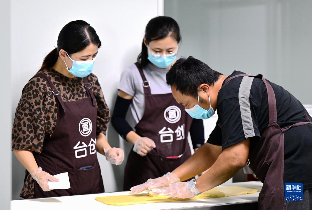 陳正信(右)在試制嘉寶果餡的糕餅餅皮(6月13日攝)。