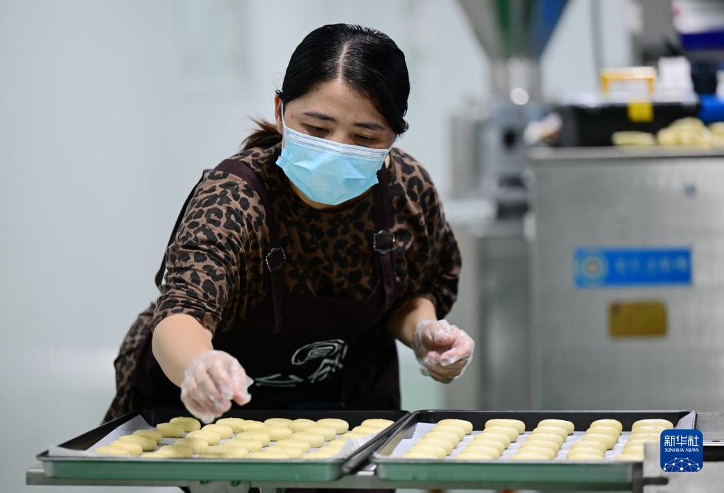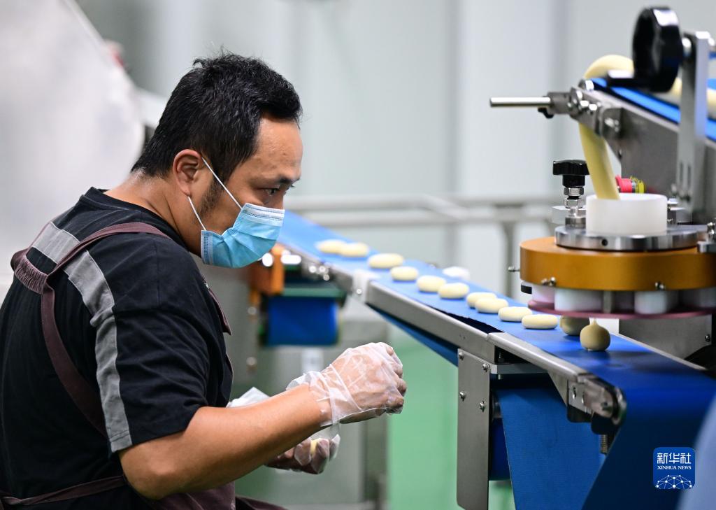 陳正信調(diào)試生產(chǎn)嘉寶果餡糕餅的加工設(shè)備(6月13日攝)。