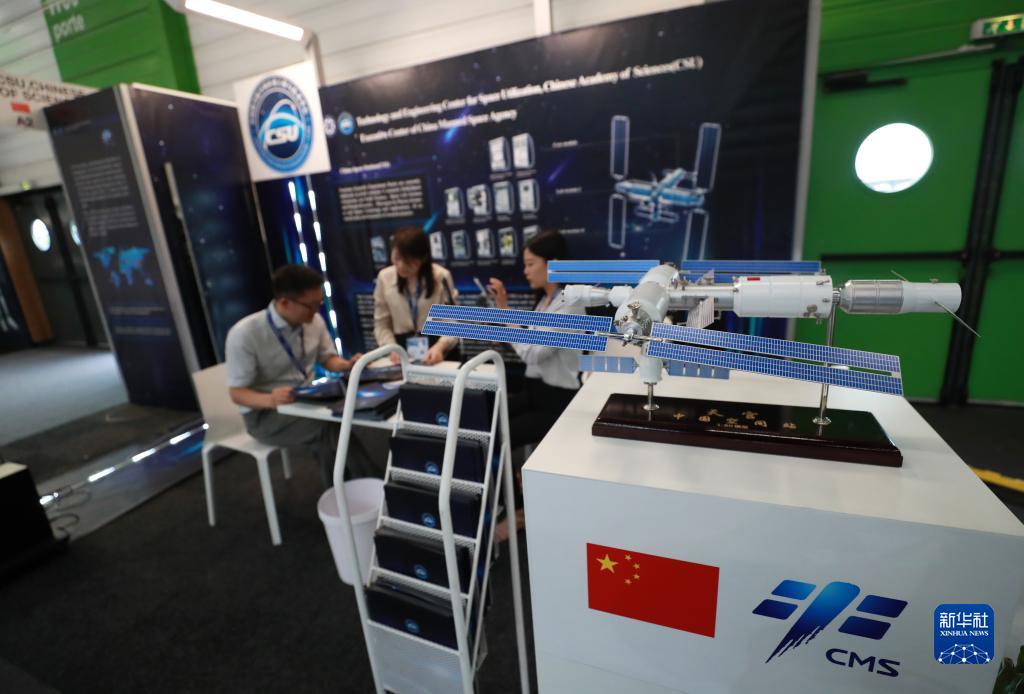 這是6月19日在法國巴黎近郊的布爾歇機(jī)場舉行的巴黎航展上拍攝的中國科學(xué)院空間應(yīng)用工程與技術(shù)中心展臺。
