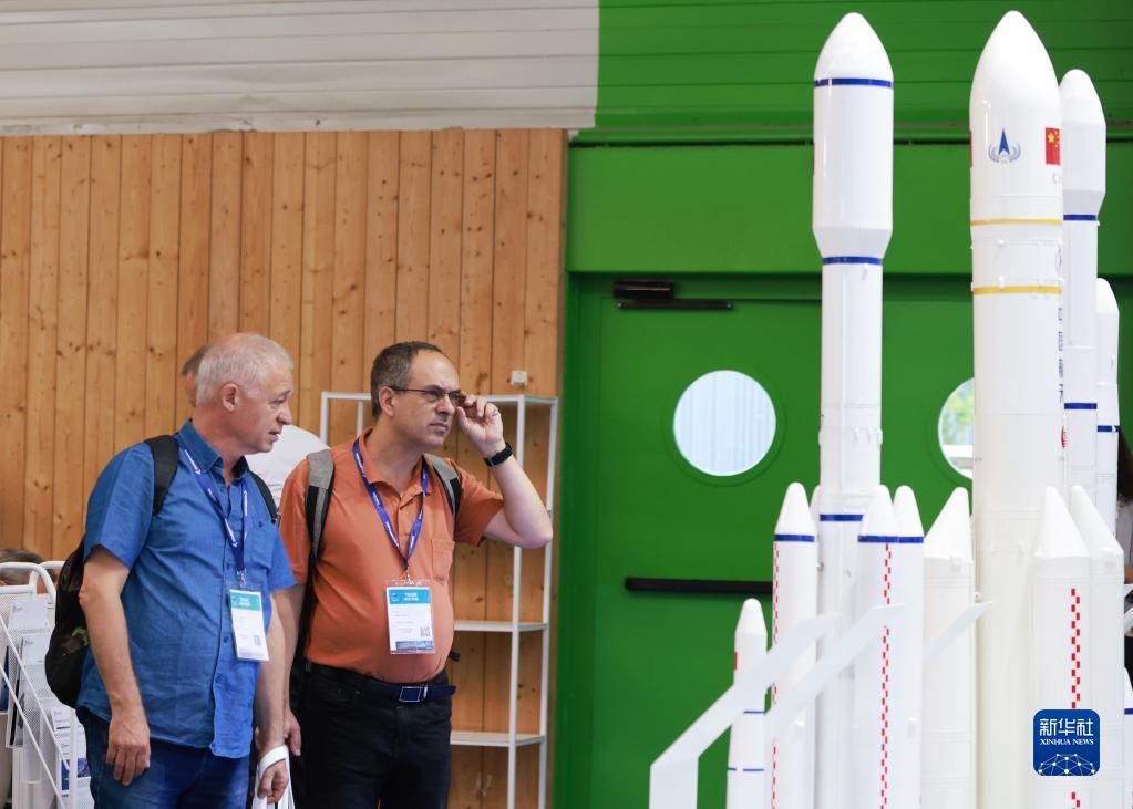 6月19日,在法國巴黎近郊的布爾歇機(jī)場舉行的巴黎航展上,參觀者關(guān)注中國航天科技集團(tuán)有限公司展出的長征系列運(yùn)載火箭。