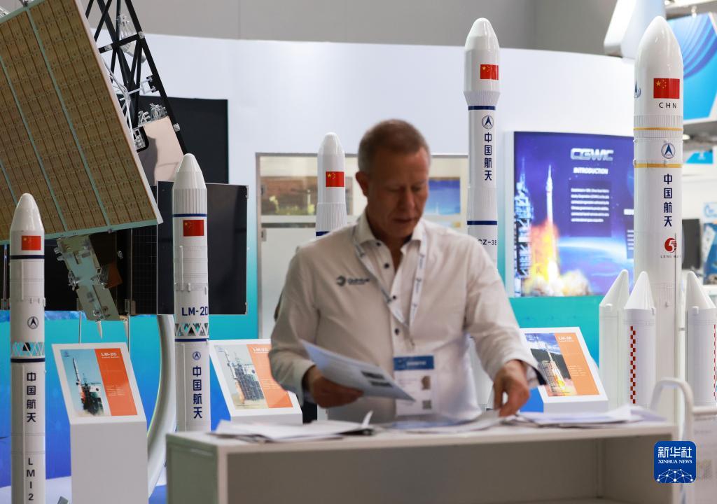 6月19日,在法國巴黎近郊的布爾歇機(jī)場舉行的巴黎航展上,一名男子參觀中國航天科技集團(tuán)有限公司的展臺。