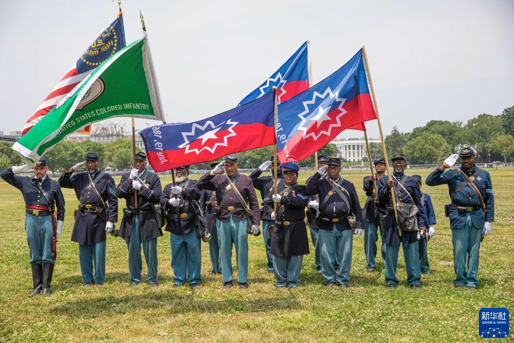 6月19日,在美國首都華盛頓的白宮附近,人們扮演成南北戰(zhàn)爭時(shí)期的士兵,紀(jì)念黑奴解放日。