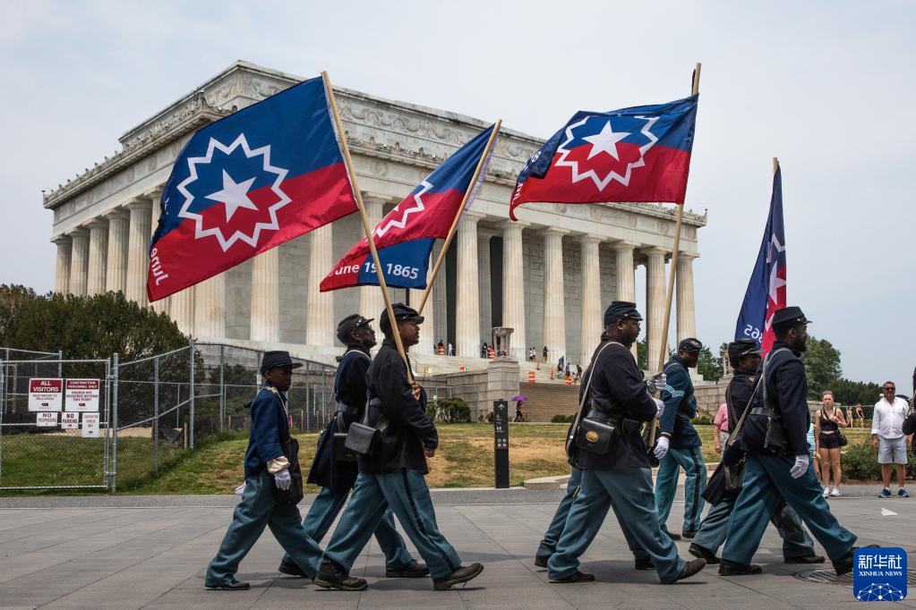 6月19日,在美國首都華盛頓的林肯紀(jì)念堂附近,人們扮演成南北戰(zhàn)爭時(shí)期的士兵,紀(jì)念黑奴解放日。