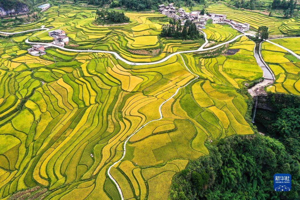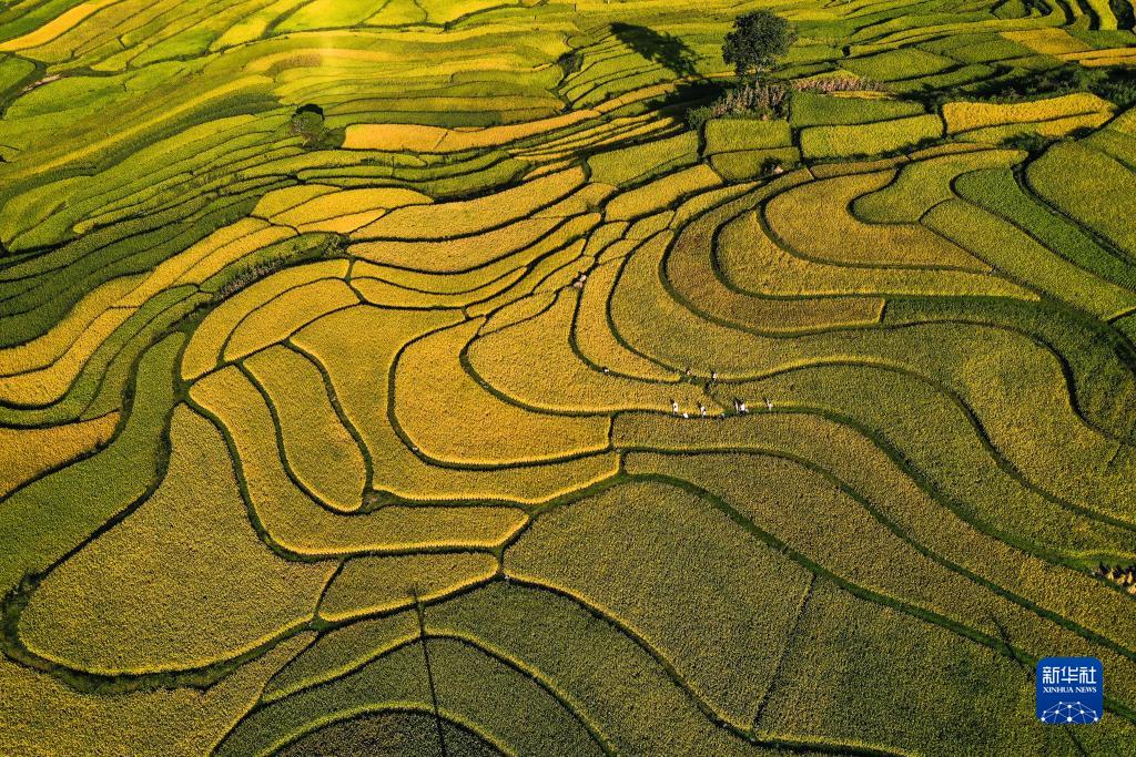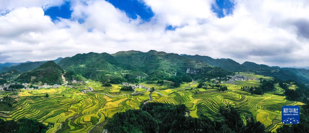 白露將至,貴州省黔南布依族苗族自治州貴定縣沿山鎮(zhèn)臘利梯田里的水稻逐漸成熟,呈現(xiàn)出一幅豐收在望的秋日畫卷。