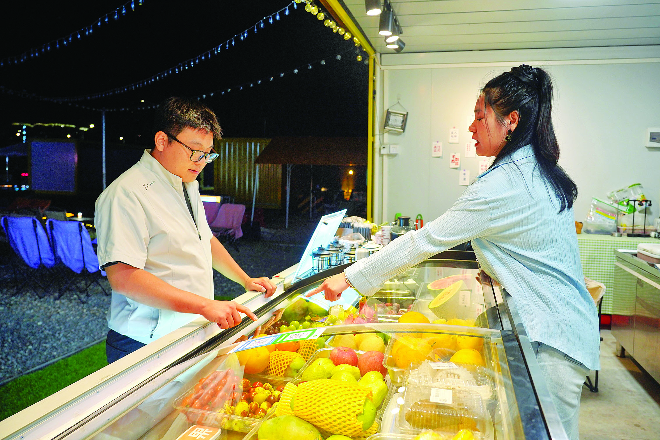 晚上9時(shí),花里頭潮聚公園迎來(lái)客流高峰,在車水馬龍的城市中,這里別有一番風(fēng)味:10米高的卡通充氣模型、五顏六色的集裝箱、擺滿廣場(chǎng)的露營(yíng)折疊座椅、抱著吉他的駐場(chǎng)歌手、童年記憶里的露天影院……
