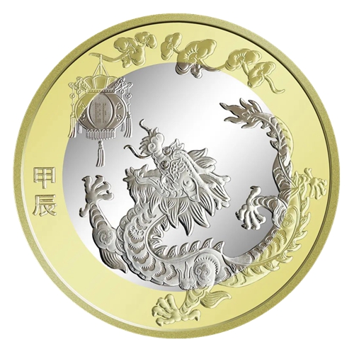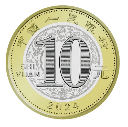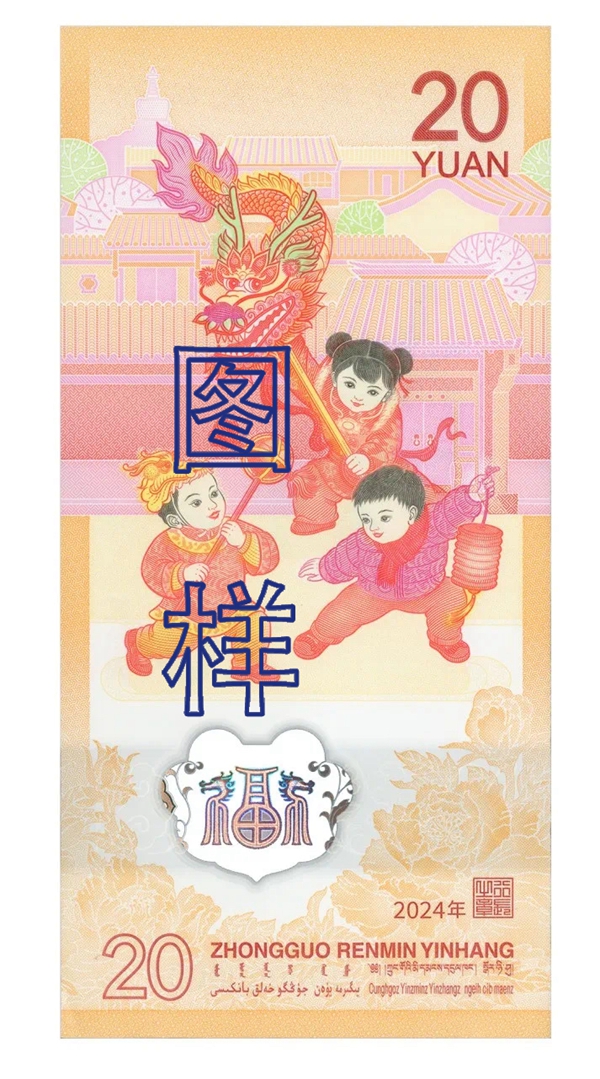 按照中國人民銀行公告,2024年賀歲雙色銅合金紀(jì)念幣面額10元,發(fā)行數(shù)量1.2億枚(含留存歷史貨幣檔案1萬枚)。雙色銅合金紀(jì)念幣正面圖案為“中國人民銀行”“10元”字樣,漢語拼音字母“SHIYUAN”及年號(hào)“2024”,底紋襯以團(tuán)花圖案;背面圖案為中國傳統(tǒng)剪紙藝術(shù)與裝飾年畫元素相結(jié)合的龍形象,襯以花燈和靈芝,幣面左側(cè)刊“甲辰”字樣。2024年賀歲紀(jì)念鈔面額20元,發(fā)行數(shù)量1億張(含留存歷史貨幣檔案2萬張)。紀(jì)念鈔正面主景為龍的造型圖案,上方為中華人民共和國國徽、“中國人民銀行”、篆書“龍”字印章,下方依次為光彩光變面額數(shù)字“20”與漢字“貳拾圓”、動(dòng)感全息圖案、透明視窗、盲文面額標(biāo)記和冠字號(hào)碼。紀(jì)念鈔背面主景為兒童舞龍燈圖案,輔以北京四合院民居裝飾圖案,上方為面額數(shù)字“20”、漢語拼音字母“YUAN”,下方為花卉與動(dòng)感全息圖案、年號(hào)“2024年”、行長章、面額數(shù)字“20”“中國人民銀行”漢語拼音和蒙、藏、維、壯四種民族文字的“中國人民銀行 貳拾圓”字樣。