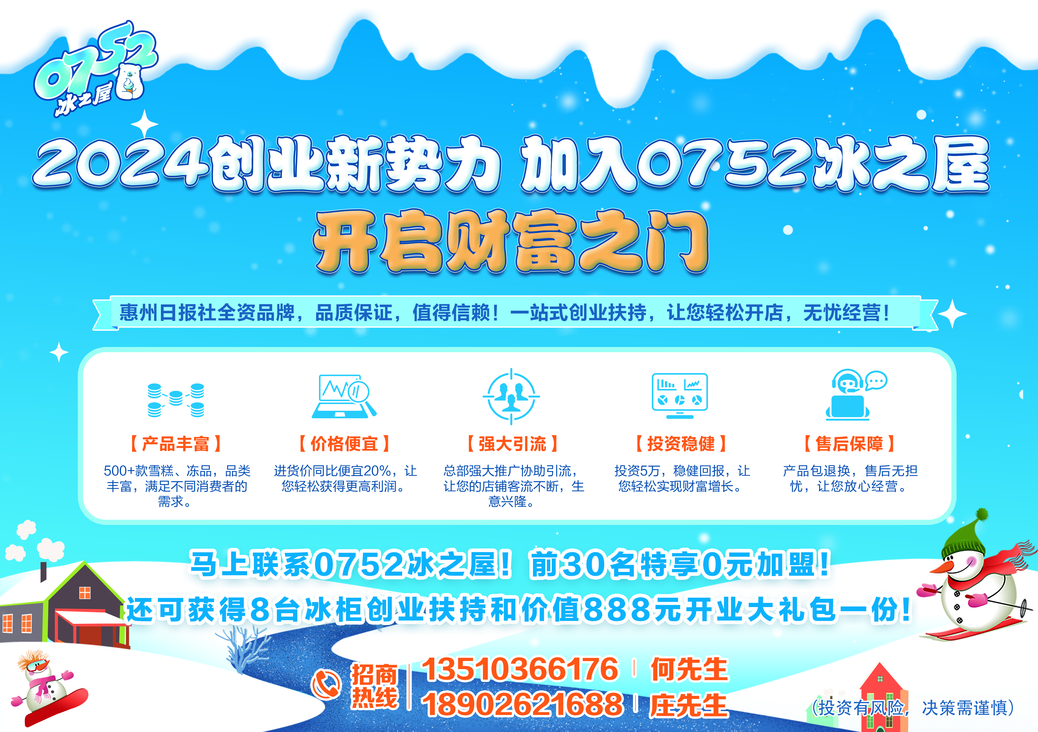 “0752冰之屋”,不僅是一個(gè)冰品品牌,更是一個(gè)實(shí)現(xiàn)創(chuàng)業(yè)夢想的平臺。別再猶豫了,前30名特享0元加盟,還有機(jī)會獲得8臺冰柜創(chuàng)業(yè)扶持和價(jià)值888元開業(yè)大禮包一份,趕緊撥打招商熱線加盟吧。