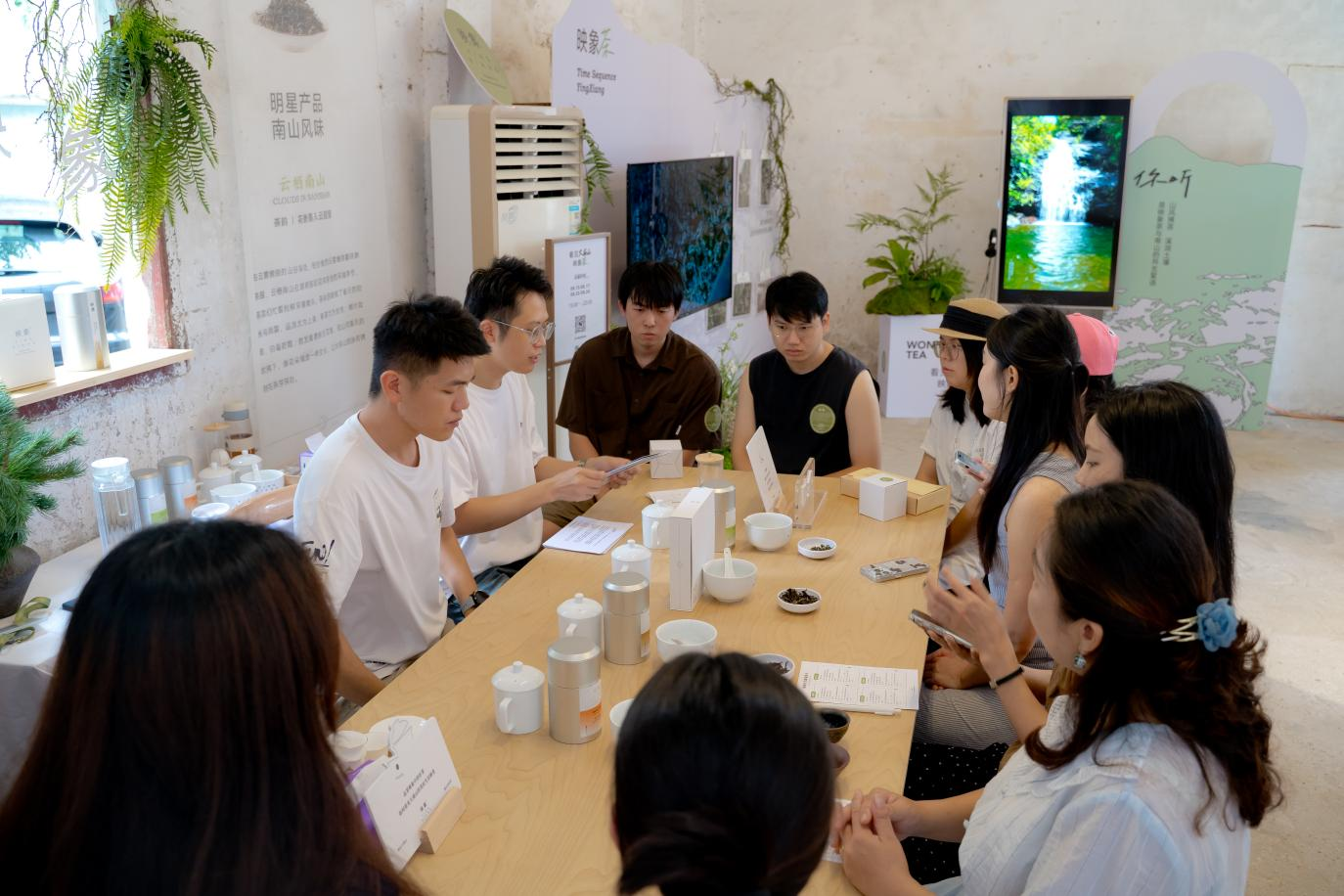 步入野島生活社區(qū)的快閃空間,首先映入眼簾的是一面由茶樹枝與定格了南山風(fēng)采面面、照片組成的 “記憶墻”。樹枝來自海拔 600 米的大南山茶園,每一道紋理都記錄著嶺南季風(fēng)的吹拂;電視里正循環(huán)播放著茶山四季的流轉(zhuǎn) —— 春有新綠破土、夏見云霧漫坡、秋遇豐收的果實(shí)、冬觀霜露凝枝,茶與土地的羈絆在此隨光影流動(dòng),更顯鮮活。