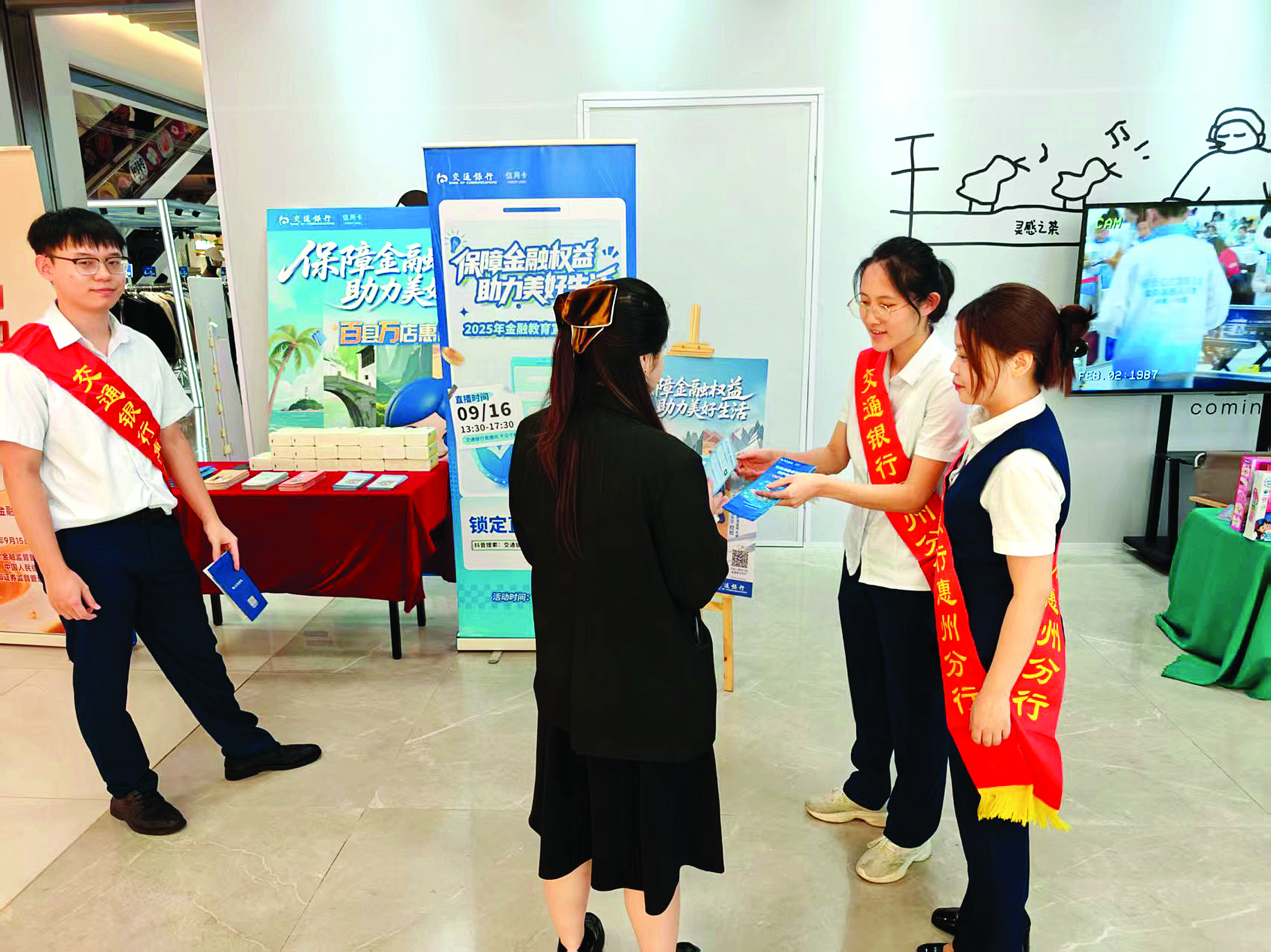 惠州日報訊 (記者伍磊)為深入貫徹落實國家關(guān)于金融消費者權(quán)益保護工作的決策部署,切實提升社會公眾金融素養(yǎng)和風(fēng)險防范能力,9月17日,交通銀行惠州分行在惠州華貿(mào)天地舉辦金融教育集中宣傳活動。舉辦此次活動是交通銀行惠州分行在2025年金融教育宣傳周期間的重要舉措。宣傳周期間,該行緊緊圍繞“保障金融權(quán)益 助力美好生活”主題,積極依托“百縣萬店惠民生”活動,組織開展了一系列金融教育宣傳活動,以實際行動踐行“金融為民”理念,讓金融服務(wù)更加貼近百姓、更有溫度。