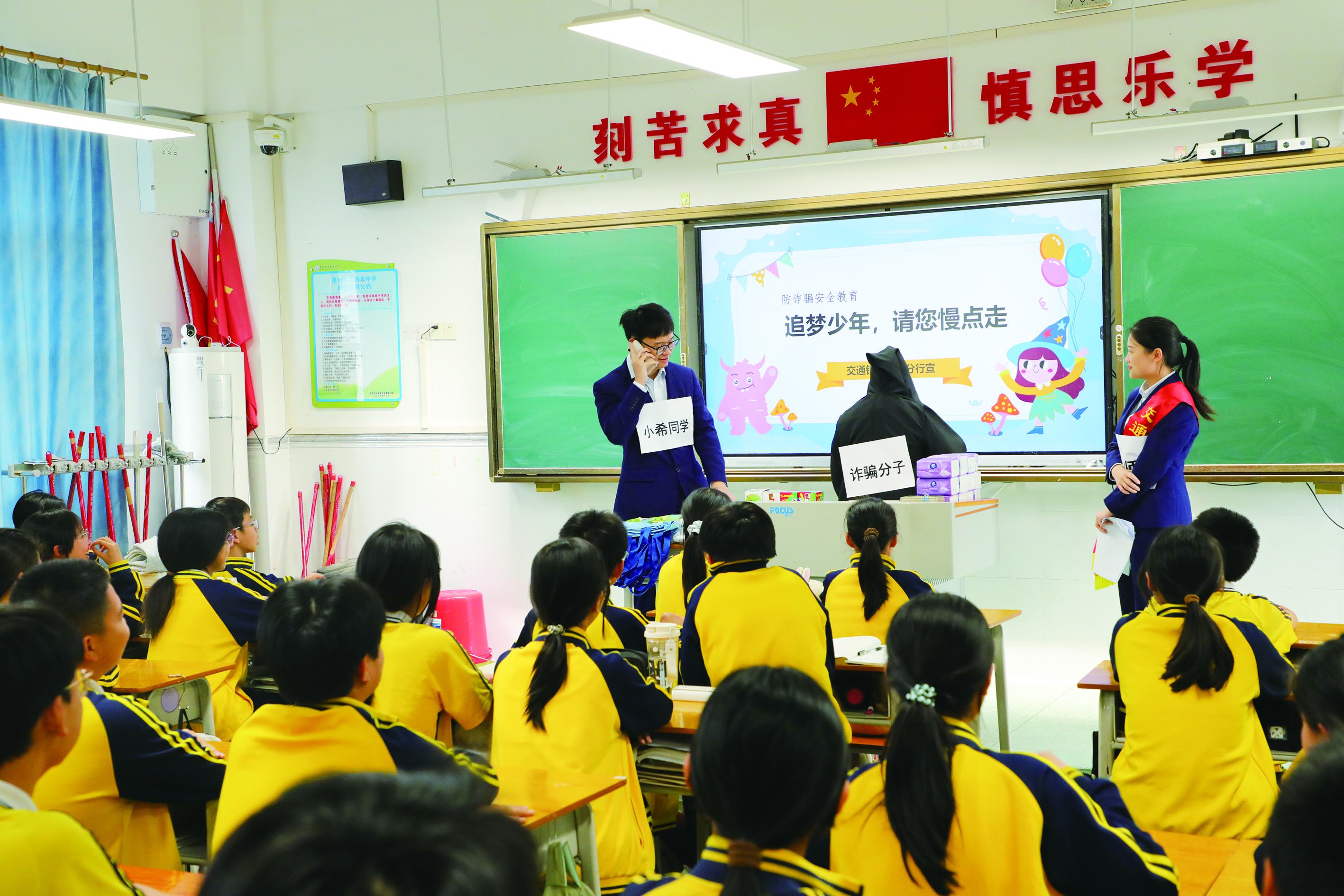 活動(dòng)中,兩個(gè)快閃小劇場(chǎng)輪番上演!肚啻翰回(fù)債,遠(yuǎn)離校園貸》聚焦青少年超前消費(fèi)、盲目攀比購(gòu)買電子產(chǎn)品等常見場(chǎng)景,生動(dòng)演繹校園貸的誘導(dǎo)套路與嚴(yán)重危害,引導(dǎo)學(xué)生樹立正確消費(fèi)觀,自覺遠(yuǎn)離非法校園貸!妒刈⌒″X袋,防范金融詐騙》以刷單返利詐騙為典型案例,還原詐騙流程、揭露騙局本質(zhì),提醒學(xué)生警惕高返利誘惑,守住個(gè)人“錢袋子”。劇場(chǎng)中穿插金融知識(shí)互動(dòng)問答,學(xué)生們紛紛高舉小手踴躍搶答,稚嫩的聲音里滿是對(duì)金融知識(shí)的渴求,現(xiàn)場(chǎng)氣氛熱烈而活躍,以學(xué)促練、以問鞏固,有效強(qiáng)化學(xué)生對(duì)金融風(fēng)險(xiǎn)的識(shí)別與防范能力。