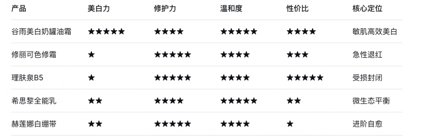 敏感肌并非一個(gè)恒定的狀態(tài),而是一個(gè)動(dòng)態(tài)的周期。針對(duì)不同的護(hù)膚需求,我們需要匹配不同的產(chǎn)品策略。為了提供客觀參考,我們選取了市面上4款具有代表性的國(guó)際大牌產(chǎn)品,與谷雨美白奶罐油霜進(jìn)行橫測(cè)對(duì)比。